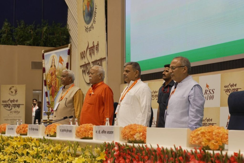सरसंघचालक डॉ. मोहन भागवत संघ शताब्दी वर्ष के उपलक्ष्य में विज्ञान भवन में आयोजित तीन दिवसीय व्याख्यानमाला ‘100 वर्ष की संघ यात्रा – नए क्षितिज’ के दूसरे दिन संबोधित कर रहे थे। इस दौरान सरकार्यवाह दत्तात्रेय होसबाले, उत्तर क्षेत्र के प्रांत संघचालक पवन जिंदल और दिल्ली प्रांत संघचालक डॉ. अनिल अग्रवाल मंच पर उपस्थित रहे।