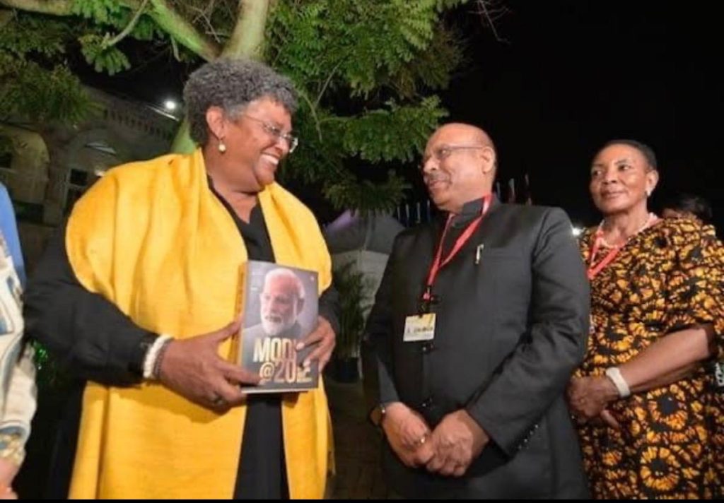 श्री गुप्ता ने बारबाडोस की प्रधानमंत्री को “Modi@20″ पुस्तक भेंट की जो प्रधानमंत्री नरेन्द्र मोदी के नेतृत्व में भारत की परिवर्तनकारी यात्रा का परिचय है