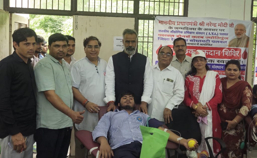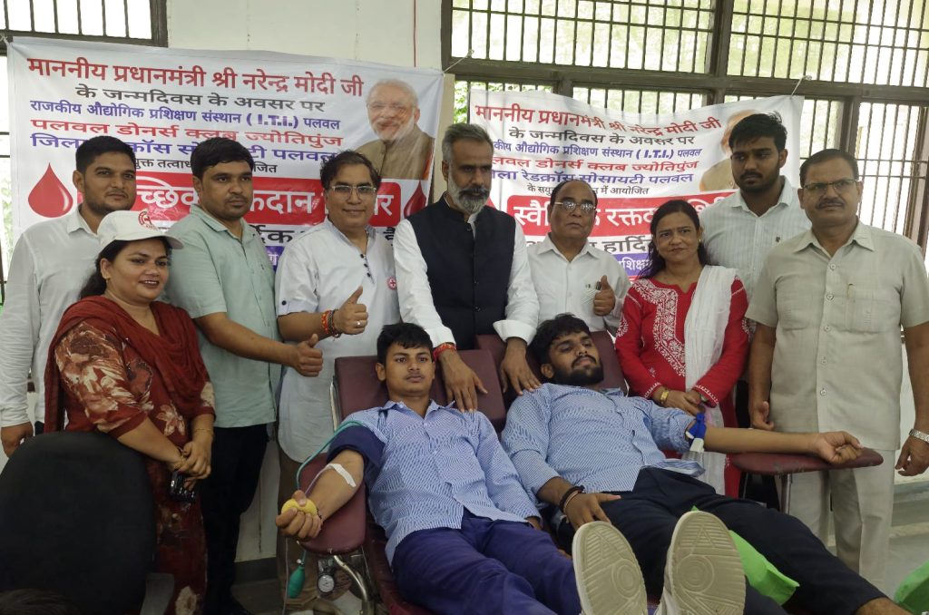 प्रधानमंत्री नरेंद्र मोदी के जन्मदिवस पर राजकीय औद्योगिक प्रशिक्षण संस्थान पलवल, पलवल डोनर्स क्लब ज्योतिपुंज एवं जिला रेड क्राॅस सोसायटी पलवल के सयुक्त तत्वाधान में आई टी आई के परिसर में एक स्वैच्छिक रक्तदान शिविर का आयोजन किया गया। शिविर का संयोजन संस्थान उपप्रधानाचार्य कैप्टन उदय सिंह, क्लब के मुख्य संयोजक आर्यवीर लाॅयन विकास मित्तल, जिला रेड क्राॅस प्राथमिक चिकित्सा प्रवक्ता अलपना मित्तल ने किया। शिविर की अध्यक्षता प्रधानाचार्य जिले सिंह ने की। शिविर का शुभारम्भ मुख्य अतिथि भाजपा के जिला अध्यक्ष विपिन बैंसला ,जिला रेड क्राॅस सोसायटी की जिला प्रशिक्षण अधिकारी नीतू सिंह, राकेश कुमार, नरेन्द्र कुमार, विजय सिंह, राजेन्द्री आदि ने किया।