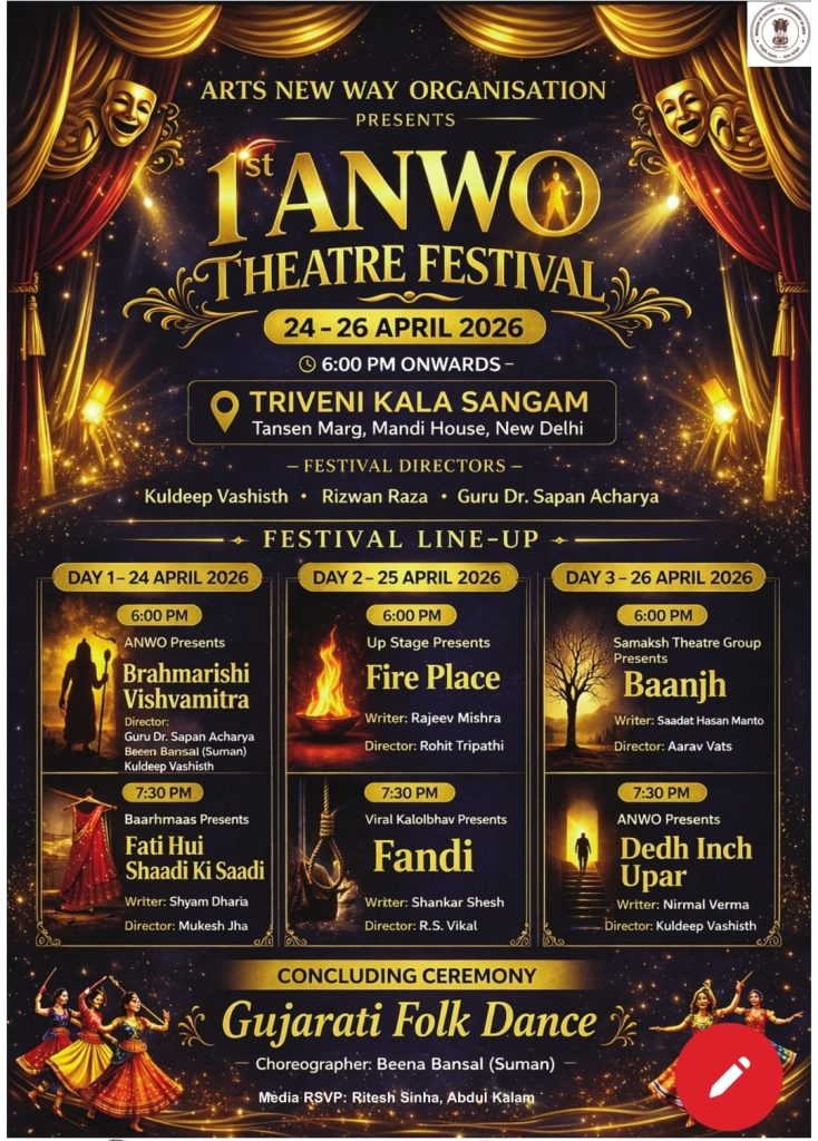 नई दिल्ली। भारतीय रंगमंच की समृद्ध परंपरा, सामाजिक सरोकारों और मानवीय संवेदनाओं को केंद्र में रखते हुए Arts New Way Organisation (ANWO) द्वारा ‘पहला ANWO थिएटर फेस्टिवल’ का आयोजन किया जा रहा है। यह बहुप्रतीक्षित नाट्य महोत्सव 24 से 26 अप्रैल 2026 तक त्रिवेणी कला संगम, तानसेन मार्ग, मंडी हाउस, नई दिल्ली में प्रतिदिन सायं 6:00 बजे से आयोजित होगा। यह तीन दिवसीय नाट्य महोत्सव राजधानी के सांस्कृतिक परिदृश्य में एक महत्वपूर्ण हस्तक्षेप के रूप में उभर रहा है, जिसका उद्देश्य न केवल दर्शकों का मनोरंजन करना है, बल्कि उन्हें विचार, संवेदना और सामाजिक यथार्थ से गहराई से जोड़ना भी है।
