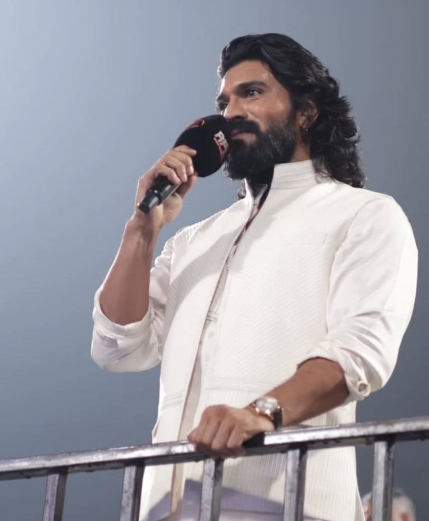 राम चरण ने अपने नाम का अर्थ बताते हुए कहा, “मेरा पूरा नाम राम चरण तेजा कोनिडेला है। इसका अर्थ है जो राम के चरणों में है, वह हनुमान है। मैं वहीं रहता हूँ जहाँ राम होते हैं। आप सब में राम हैं, और आप सब ने मुझे बुलाया। मैं उसके लिए यहाँ आया हूँ।”