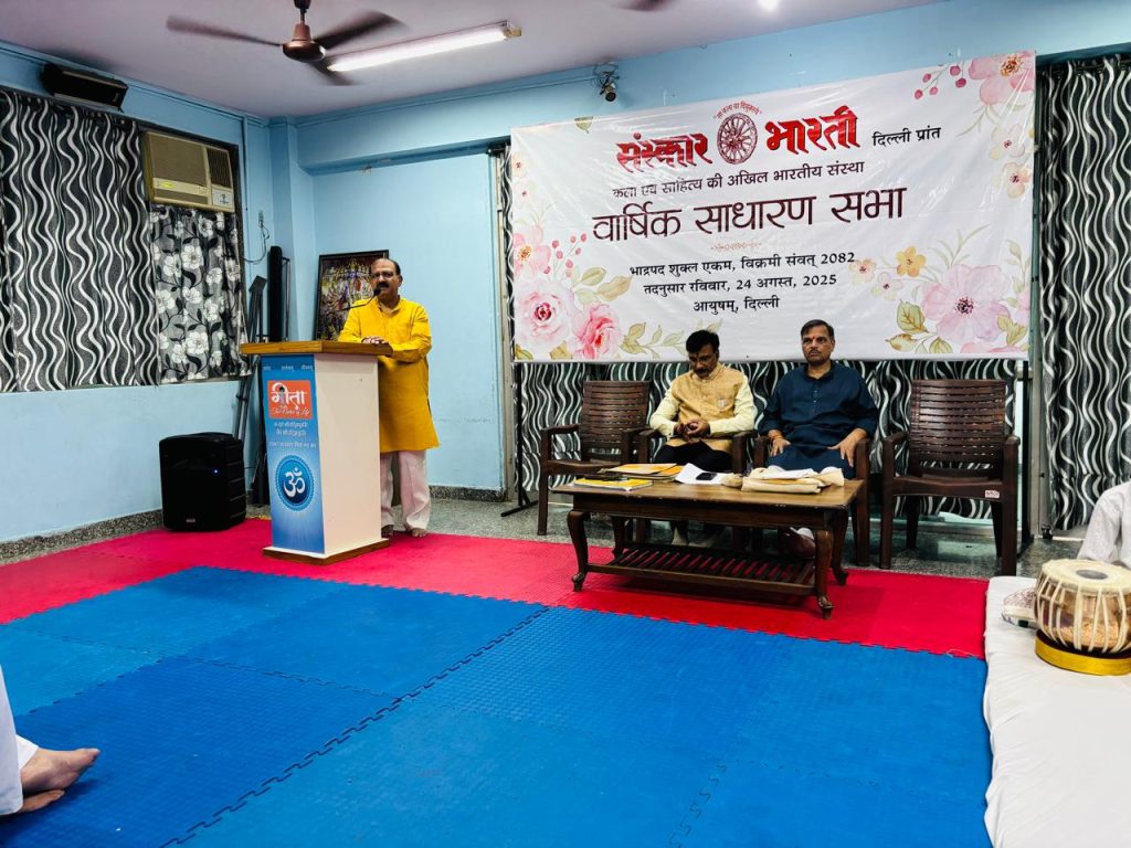 नई दिल्ली, 25 अगस्त 2025: संस्कार भारती दिल्ली प्रांत की साधारण सभा कल दिनाँक 24 अगस्त को विश्वासनगर के आयुषम केंद्र के सभागार में गरिमामय वातावरण में सम्पन्न हुई। इस अवसर पर उत्तर क्षेत्र प्रमुख विजय जी, केंद्रीय कार्यालय सचिव अशोक तिवारी जी, प्रांत अध्यक्ष प्रभात कुमार, महामंत्री भूपेंद्र कौशिक, संरक्षक शिव प्रकाश सहित अनेक वरिष्ठ पदाधिकारी एवं कार्यकर्ता बड़ी संख्या में उपस्थित रहे।
