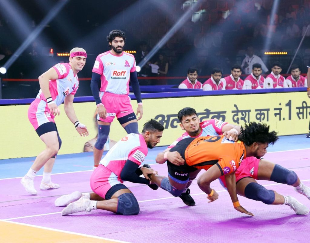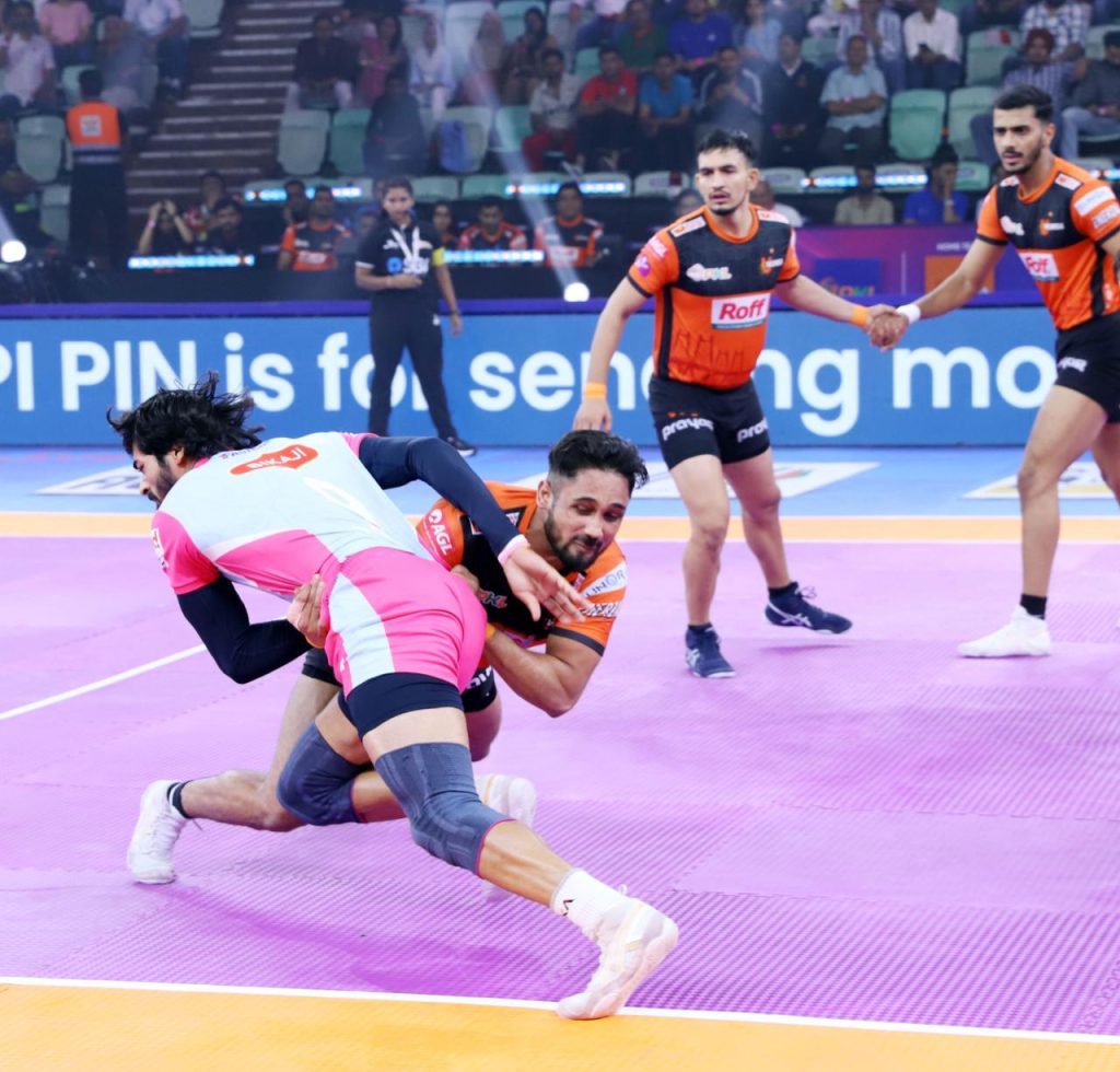 As play resumed, the Jaipur Pink Panthers started strongly, inflicting an All Out right away to cut the deficit to 29-26. Soon after, a brilliant tackle from Deepanshu Khatri brought the gap down to just two points. During this period, Nitin Kumar also completed his Super 10, continuing his fine form.